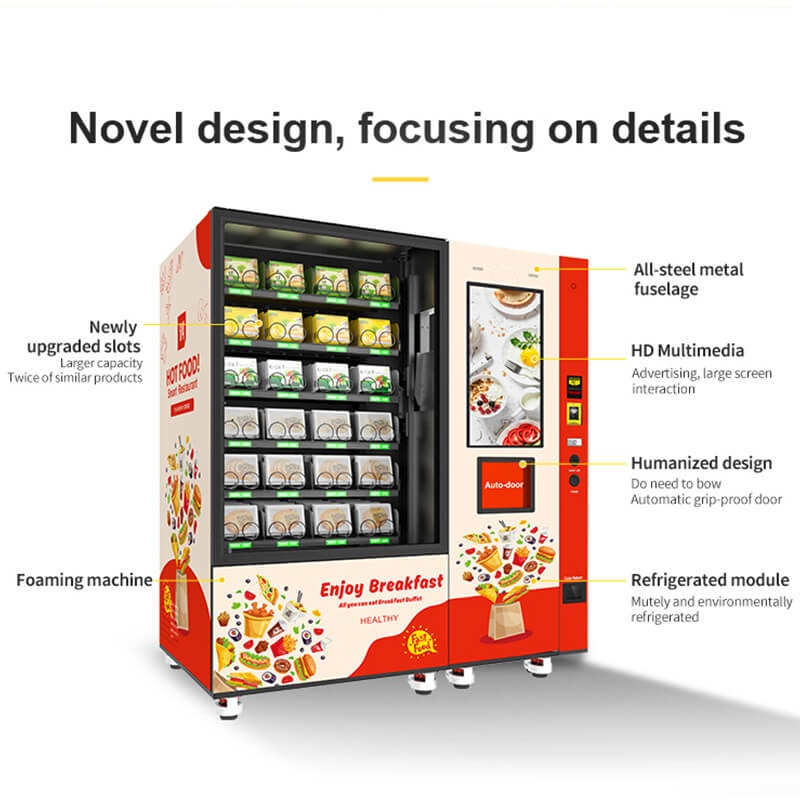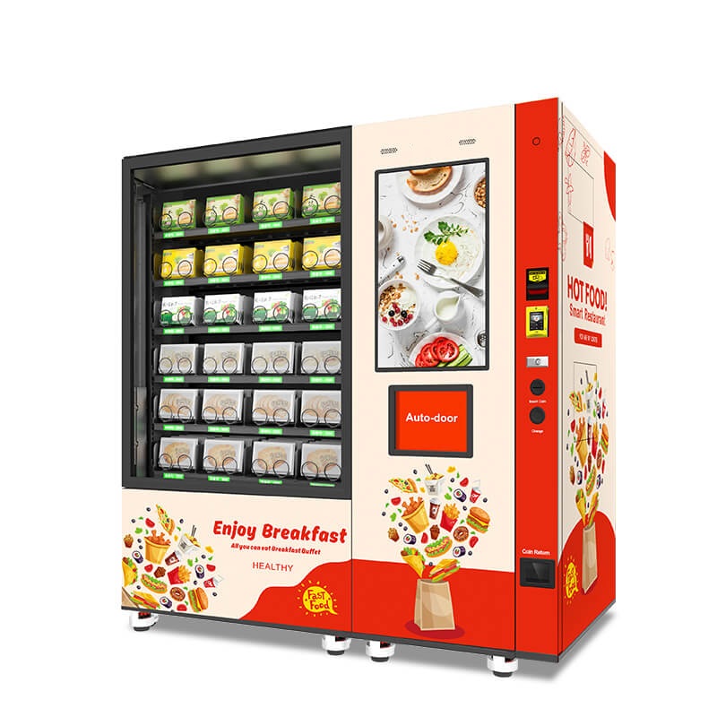 Descriere Produs: Automat Hot Food cu elevator, cu sloturi cu împingător și arc, compatibile cu o gamă variată de produse.